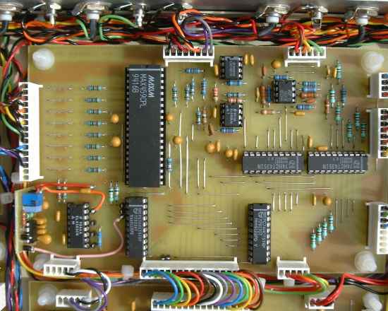 AVMUX is the board responsible for routing the video and audio signals. It also houses the caption insertion mixer and audio filters. The small daughter board (bottom left) is the PLL sync detector. Video to the transmitter output socket passes through a black-level clamp to remove any DC offsets from the signal and to reduce ‘tilt’ in the video waveform.