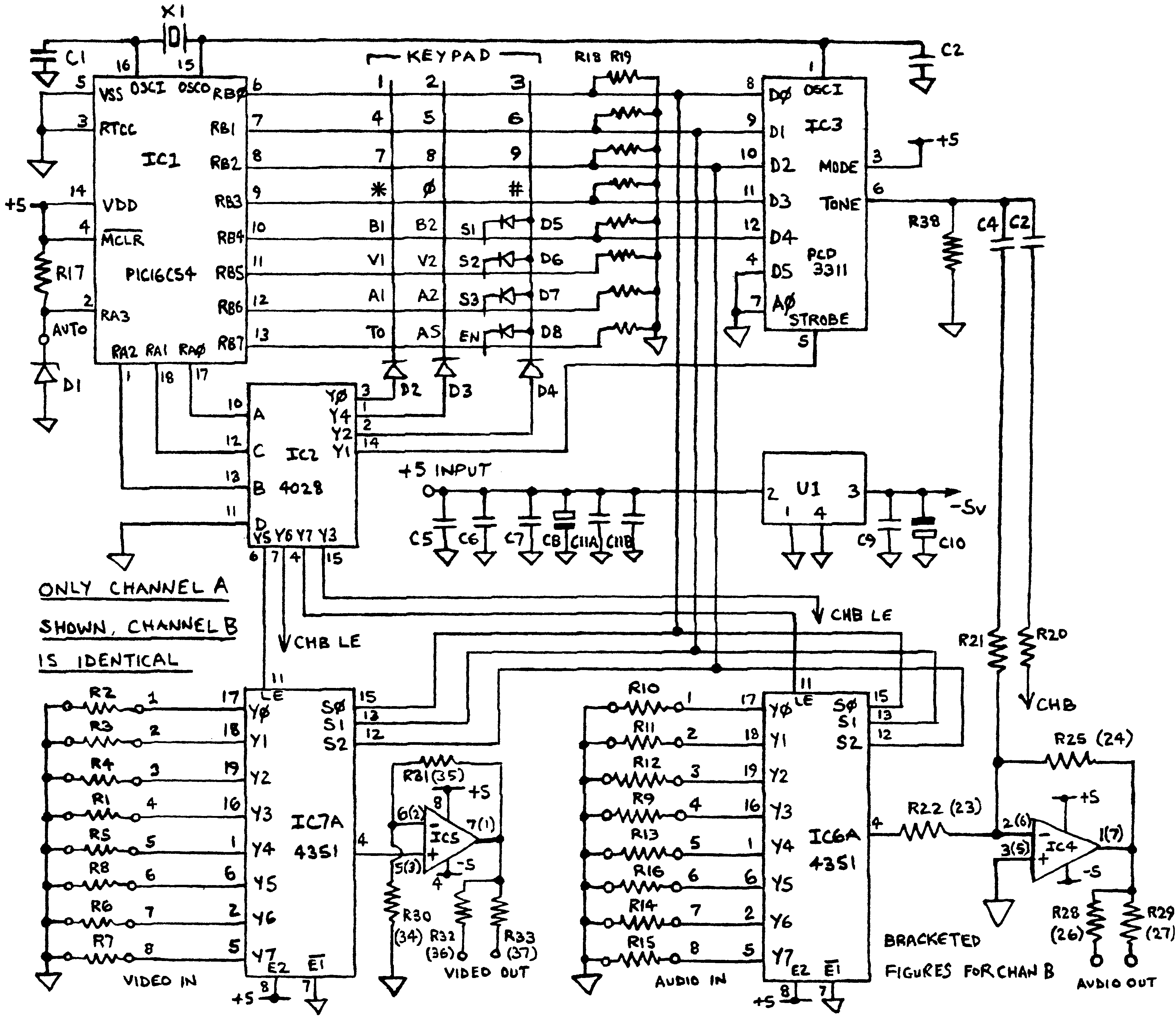 Microcontroller IC1 has a 4 bit port (RA) and an 8 bit port(RB). RA pins 0,1 & 2 carry a binary number which is decoded by IC2 to select the columns of the keypad or the select pins on the tone generator or the input selector switches. This number counts so that all the keypad columns are activated in turn. If a key is pressed while a column signal is active it connects the column signal to the RB pins where the program works out which key it was. If it was a function key the controller memorises the new mode it is to work in and applies it when the next digit key is pressed. If it was the tone mode key the digit is passed to IC3 which is a programmable tone generator, if a channel key it passes the digit to the appropriate IC6 or IC7 input selector. If RA3 pin is pulled to 0V it starts a timer which waits three-quarters of a second then sends the antenna selection signal, pressing the AS key does the same but without the delay. IC4 is the audio output buffer, it provides sufficient output power to drive two loads on each channel at once and produces a virtual earth summing point where the audio input and tones can be summed together safely. IC5 buffers the two video channels so each can drive two 75 ohm loads simultaneously. To allow DC coupling through all the channels a split supply is needed, this is provided by U1 which derives a negative five volt supply from the incoming positive five volt line. The reference frequency for the tone generator is also used as the microcontroller clock signal and is produced by IC1s internal oscillator circuit , X1, C1 and C2.