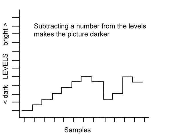 As the picture is made of samples (pixels) and each has a numeric value, simply adding or subtracting from the value will shift the brightness (fig.4abc). The normal value ranged used is 0 - 255 (assuming 8-bit data, it’s 0-1024 if 10-bit data is used) with higher numbers meaning nearer to peak white. Moving all the pixels up in value makes the whole picture move toward the peak white level. Conversely, if the pixel values are reduced the picture goes darker. Obviously, there is a need to constrain the values so they do not go outside the valid range but that’s easy to do.