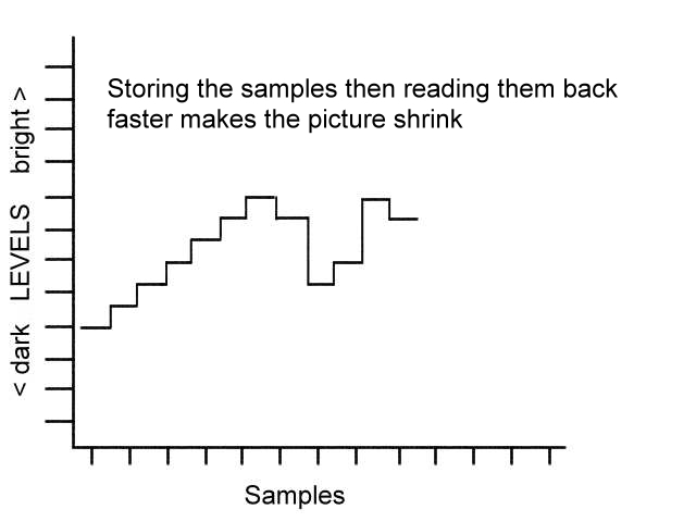 All the digital methods mentioned so far have had some sort of effect on the picture in a fixed place on the screen, whether changing its level or origins. Digital offers a whole new selection of ‘spatial’ effects as well. While it is true that these can also be done using analogue circuits, they would be tremendously complicated and tedious to adapt to different situations. The ‘spatial’ word simply refers to something’s position relative to the space around it. Crucial to digital spatial effect is the memory device and the fact that once stored, video samples can be retrieved in a different order. Ordinarily, as the DAC produces its samples they would be stored in the next available memory address. If retrieved in the same order and at the same rate, the picture could be reproduced through an ADC to show exactly the same image as was stored. Now imagine what would happen if the memory addresses were read back in reverse order; the picture would also be reversed. Try doing that with an analogue circuit! In fact, there is no reason why the addresses need to be in sequence at all, forwards or backwards, they can even be completely random. Those who can remember the Videocrypt pictures that used to be used by BskyB satellite broadcasts will have noticed that even when the picture was ‘scrambled’ it was possible to tell if subtitles or scrolling credits were being shown. That was because each line was stored in a memory device and replayed in a different horizontal position according to a secret sequence of memory address lines. The trick was known as ‘cut and rotate’ because each line had several ‘cut’ points where the playback addresses switched and between each ‘cut’ the picture was ‘rotated’ or reversed. Reading the samples differently to the way they were stored is not only used for encryption though. If a fixed number is added to the memory address, the recovered picture will move across the screen. Adding a number equal to the length of each line will move the picture up or down. Reading the data back quicker than it was stored makes the picture narrower and the reverse, reading back slower makes it wider (fig.6).