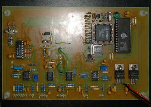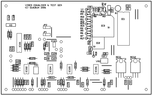 The PCB is relatively easy to build. Apart from the usual anti-static precautions when handling the integrated circuits everything is robust and easy to work with. The only awkward component is IC103 which is only available in a surface-mount package. The underside of the IC has a bare metal area which should be connected to the same point as pin 4. As far as I can tell, the reason for this is to provide better heat conduction away from the chip and into the PCB. In this application, the load on IC103 is the 1K Ohm level potentiometer rather than the 75 Ohms it would normally work with and the heat generated is therefore a little lower than normal. It is still best to connect the base pad if possible and the best way to do this is to pre-tin the PCB copper with a thin, level layer of solder then with the IC held in position, apply heat to the PCB as close to the chip as possible . Let the solder melt for about three seconds, this should be long enough for the flowing solder to bond with the underside of the IC. The pins can then be soldered as usual. Run a wire link from both crystal cans to ground, this will improve frequency stability, reduce stray radiation and provide a more mechanically secure mounting.