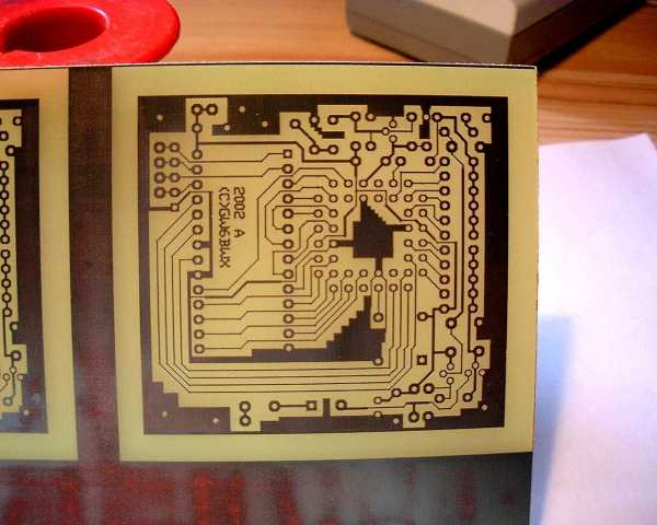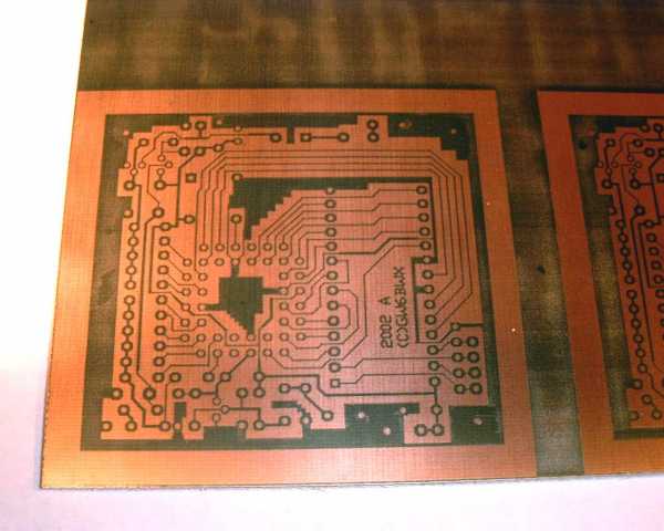 The process of transferring the design from computer screen to copper is quite clever and very similar to making photographic contact prints. What you need to do is print the track layout, in black, on to transparent film. I use the sheets designed for overhead projectors which most stationery stores can supply. Be careful though, make sure the brand you choose is designed for use in your kind of printer. Usually, one side of the sheet is glossy and one side is matt, it’s the matt side you print on or the ink will form droplets on the surface. If, like me you use a laser printer, make sure the film is suitable for laser printing or for photocopying. Both these devices use heat to fix the toner to the film and the wrong sort of transparency will feed into your printer but never come out again. Instead you will find a seriously gummed up printer mechanism, you were warned!