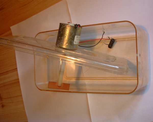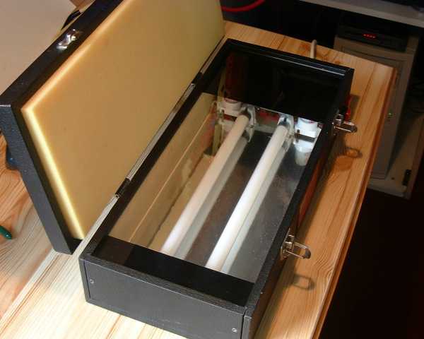 The box needs to be big enough that your biggest PCB can sit in its bottom. Mine is about 15cm front to back, about 30cm side to side and about 10cm deep. This comfortably holds a standard Eurocard (100 x 160mm) board, a size readily available. The top of the box must be clear glass and if possible it should either have a hinged lid or you should have a removable lid that sits flat on the glass. Fit some thin spongy foam to the underside of the lid. The plan is to place the printed film on top of the glass and then place the light sensitised board on top of it. The weight of the lid and the sealing effect of the sponge should hold the board and film flat against the glass. Its quite important if you hinge the lid that it doesn’t shift the board relative to the film when you close it or the image will be in the wrong place or even off the edge of the board after exposure. In the bottom of the box you need at least one UV strip tube as a light source these are inexpensive and will last for hundreds of boards. The tubes are available from Farnell, Maplin and CPC amongst others but don’t get the ones for disco lighting or EPROM erasers, they are unsuitable for this application. I use two 8W tubes, spaced about 5cm apart as this gives a more even coverage of light. The tubes should be at least 2cm from the glass and each will need a starter and choke. You can add a mains switch or timer if you want but I find that pulling the mains plug out works just as well.