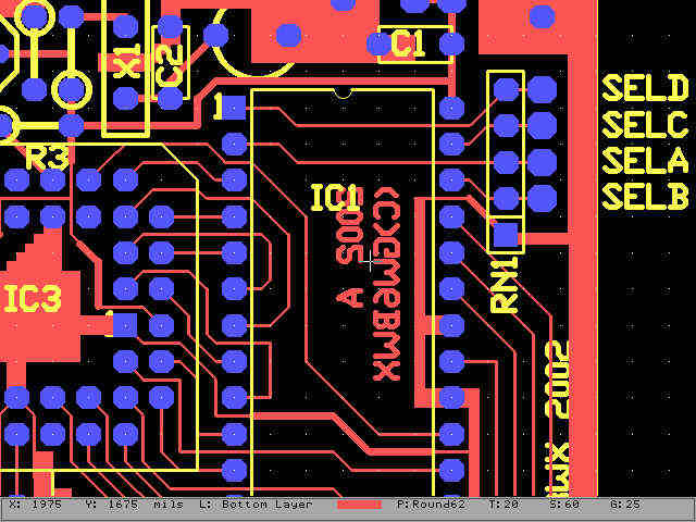 This is the step where a little artistic imagination comes into play. Other than being sensible about the placement of components that have to line up with something else or could interfere with another parts operation, you are free to do just about anything you wish. All you have to do is join the appropriate component legs together with lines. It sounds a lot simpler than it really is but with practice it isn’t too difficult. With all but the simplest designs I use a computer with a PCB design program. The one I use is Autotrax from a company called Protel . Its DOS based and by any stretch of the imagination, ancient and rather crude. It does the job though and as a freebie on Protel’s web site several years ago I can’t complain. There are many similar and more up to date packages around these days and their prices are very reasonable. I’ve seen someone design a PCB using the Windows Paint program but I would seriously recommend using one designed for the job. What all the design packages give you is a library of component "footprints", the outline of the component when it’s mounted on the board. They allow you to manoeuvre the outlines until you manage to fit everything into place and then add the lines between the component ends. The real advantage of using a computer is that the components and track lines can be erased or moved after being placed, its akin to moving text around in a word processor but you move parts of a diagram around instead. Some packages will even "auto route" the board for you. All you do is provide a list of components and a list of which pins on them connect together, known as a node list, and the computer takes over and puts the track lines in place. I must confess to having little faith in auto routers, I’ve seen some of them pick two points diagonally across the board, join them together and then refuse to connect anything one side of the line to the other because the new lines would cross the diagonal one. I always route boards by hand, I find it gives better results although it can take quite a long time to finish. Manually routing also gives you control over which connections can sensibly lie next to each other, for example, you would have the sense not to run a live mains track parallel to a microphone input signal but an auto router wouldn’t realise this was a bad thing to do.