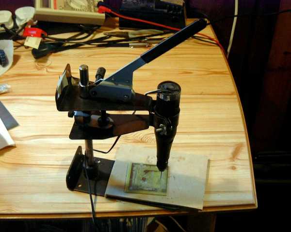 When the ink has dried or the film has cooled down you can get ready to do some photography. The aim is to expose the paint on the board to a source of ultra violet (UV) light but only in the places we want the copper removed from. The paint undergoes a chemical change when the light falls on it and it becomes soluble in developing solution. Where the black pattern on the film provided shade, preventing the light reaching the paint, it remains insoluble in developing solution.