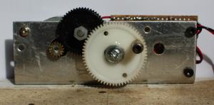 The motor was mounted first with its shaft protruding through the bracket, this made it easy to mark and drill the two fixing screws that hold it in place. With the motor cog fitted, the next step was to find the mounting centres for the two plastic gear wheels.