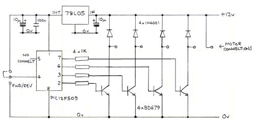 It should be self-explanatory, the '1' and '0' in the phase settings are the states of the pins driving the transistors and GPIO is the group name of the output pins on the chip. Although not used in this design, there was an unused input pin on the 12F509 so I used it to set the motor direction. Connecting it 5V or to ground will reverse the stepping direction. The compiled hex file is available here for those who do not have Oshonsofts compiler program. It is only about 120 bytes long. If you want the compiler, it is available from www.oshonsoft.com and is very inexpensive.