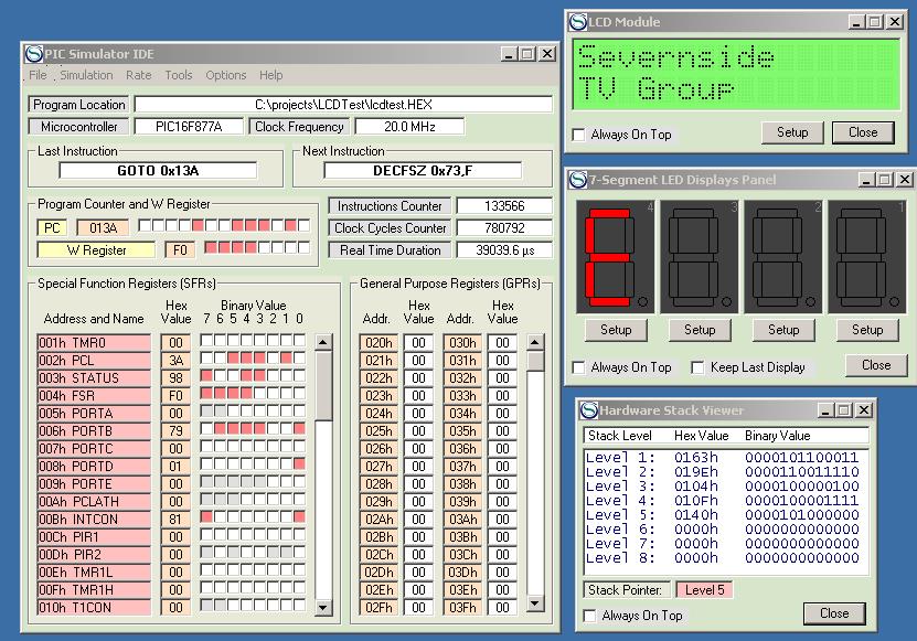 Oshonsoft’s simulator with the program, LCD, LED and stack windows open. These are just some of the windows you can open to look at the inner workings of the program.