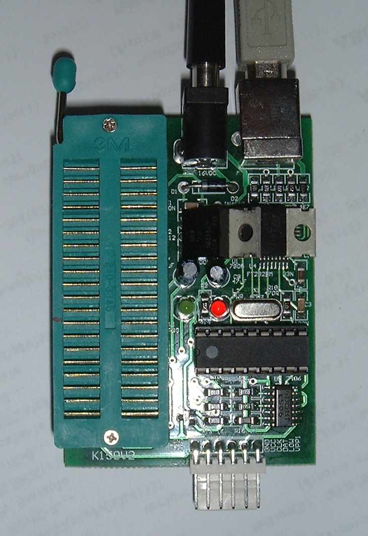 The Quasar Electronics 3150 chip programmer. It can program chips smaller than the 40-pins of the ZIF socket. The connections at the top are for power and USB. The pins at the bottom can be used to program chips which are already mounted on a PCB so they don’t have to be removed and placed in the ZIF socket. This is called ‘in circuit serial programming’.