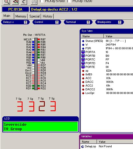 Several companies market PIC BASIC compilers but after looking at all of them, one stood out from the crowd for it’s simplicity of use and it’s low price. Written by Oshonsoft it is called “PIC Simulator IDE” and can be downloaded from www.oshonsoft.com. The ‘IDE’ part of its name stands for ‘Integrated Development Environment’, meaning you can do everything within the program to write, debug, simulate and test your work. Although this program doesn’t have an operating manual in the normal sense, it does give examples of how to use each of it’s commands and the graphical layout of the various display windows makes it very easy to understand. When a program has been written, it can be tested using a selection of commonly attached devices such as LCD displays, LED displays an oscilloscope and a waveform generator. All of these devices appear in their own windows on the computer screen and have ‘setup’ options to allow you to connect them to whatever pin you want on the PIC being simulated. When the simulation is run, the main program window shows the sequence of instructions being run and the contents of all the registers inside the chip, windows showing the attached devices update as the PIC sends signals to them. You can run the program at different speeds so you can see what’s happening in slow motion and you can ‘single step’ your program one instruction at a time to see what effect the instruction is having. I even loaded programs written in an entirely different language into PIC Simulator IDE and it correctly emulated their operation. This is one of a very few programs that can read, reverse engineer and run programs from other sources. I find this feature alone invaluable because it lets me double check the operation of programs when I no longer have the original source language files to work from. Oshonsoft charge 29Euros (about £18) for a license to use the program but it can be evaluated for a limited time free of charge. They also sell similar products for other types of processor such as the Z80 and 8085 devices